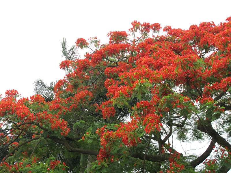 凤凰木,取名于“叶如飞凰之羽,花若丹凤之冠”。别名金凤花、红花楹树、火树、洋楹等,凤凰木因鲜红或橙色的花朵配合鲜绿色的羽状复叶,被誉为世上最色彩鲜艳的树木之一。由于凤凰树树冠高大,在夏天里具有降温增湿的小气候效应,因此,它是绿化、美化和香化环境的风景树。另外,凤凰木的树皮具有平肝潜阳、解热、治眩晕、心烦不宁的功效,而根部则可治风湿痛。