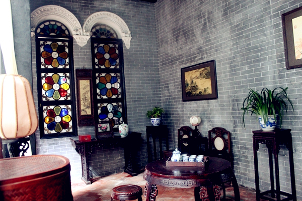 瑜园船厅拱形顶部设计的套色福寿窗与剧组布置的清代、民国风格家具相得益彰