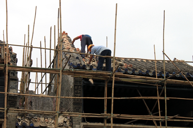 在广州大学建筑设计研究院的指导下,清理公司对跌落的建筑构件、倒塌的连廊、堆满瓦砾的屋面等进行了分类和清理。完整度较高的构件被分门别类的保存起来,在修缮过程中会尽量使用这些原构件。为了排除险情,针对屋顶露明的情况,清理公司临时采用红白蓝油布作遮盖,以防止漏雨漏风等对建筑物的不良影响。