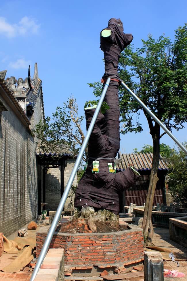 在市政园林部门的指导下,倒伏的苹婆和凤凰木被原地扶正。目前,树干用钢管支撑,包裹上专业的包树布,伤口涂上绿漆以防腐和治病。此外,古树抢救团队还为它们输营养液,以达到补充水份、防止脱水、消毒杀菌、促进生长、尽快恢复树势的效果。