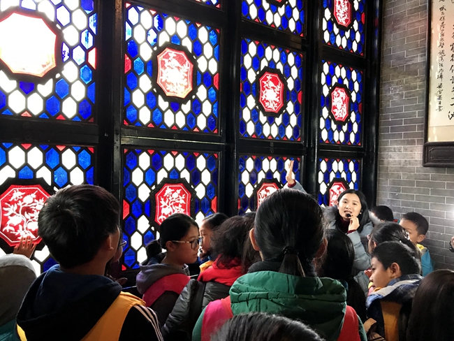 余荫山房内的装饰艺术容纳颇丰,尤其是特色的岭南窗如广式满洲窗、蚝壳窗、百叶窗等运用自如,大大加强了园林建筑的艺术美感。为了让大家对岭南窗有更深入的了解,余荫山房土木负责人邬绍坤师傅特意现场向同学们演示满洲窗的开闭功能。另外,卧瓢庐内的四季窗在彩色玻璃中隐藏的秋冬景致,百叶窗上的木轴转动而产生遮阳、遮雨、控光、透风的秘密,海月壳窗牖呈现透光、装饰的艺术效果,让家长和孩子们都惊叹不已。