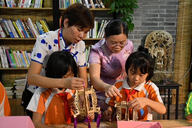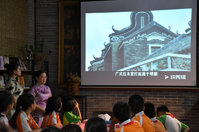 上午10点,同学们在老师的带领下,开启余荫山房写生之旅。园林建筑、假山流水、绿意融融,他们用画笔描绘下眼中的岭南名园。亭台楼阁间,处处可见孩子在画架前精心描绘,成为动人的一道风景线。写生活动结束后,学生、辅导老师及家长代表一行来到文昌苑内二楼共享书吧,进行传统广式宫灯的制作体验。一进“课室”,大家就感受到浓厚的中秋节日氛围。原来,市头小学以“我们的节日·中秋”为主题制作的手工作品铺满了展架,各式各样的灯笼、月饼模型,惟妙惟肖、充满童趣,让人忍俊不禁。“广式红木宫灯”市级代表性传承人罗敏欣老师为同学们亲自授课,指导同学们搭建灯架并在玻璃片上绘画,创作出一盏盏富有特色的传统宫灯。最后,大家在余荫山房讲解员的带领下游园赏灯,“中国梦宫灯”、“一带一路灯”等反映祖国富强、民族复兴主题的广式红木宫灯为他们上了一堂生动的爱国主义教育课。